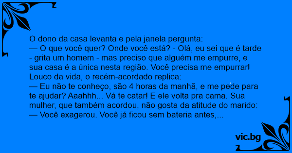 — O que você quer? Onde você está? - Olá, eu sei que é tarde - grita um homem - mas preciso que alguém me empurre, e sua casa é a única nesta região. Você precisa me empurrar! Louco da vida, o recém-acordado replica: