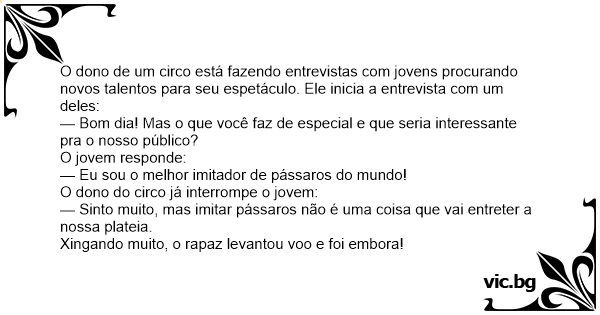 O dono de um circo está fazendo entrevistas com jovens procurando novos talentos para seu espetáculo. Ele inicia a entrevista com um deles: