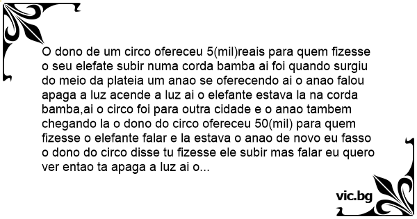 O dono de um circo ofereceu 5(mil)reais para quem fizesse o seu elefate subir numa corda bamba ai foi quando surgiu do meio da plateia um anao se oferecendo ai o anao falou apaga a luz acende a luz ai o elefante estava la na corda bamba,ai o circo foi para outra cidade e o anao tambem chegando la o dono do circo ofereceu 50(mil) para quem fizesse o elefante falar e la estava o anao de novo eu fasso o dono do circo disse tu fizesse ele subir mas falar eu quero ver entao ta apaga a luz ai o elefante respondeu apaga a luz uma роrrа vai meter o dedo no cu de outro.