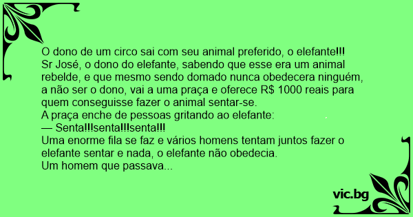 Sr José, o dono do elefante, sabendo que esse era um animal rebelde, e que mesmo sendo domado nunca obedecera ninguém, a não ser o dono, vai a uma praça e oferece R$ 1000 reais para quem conseguisse fazer o animal sentar-se.