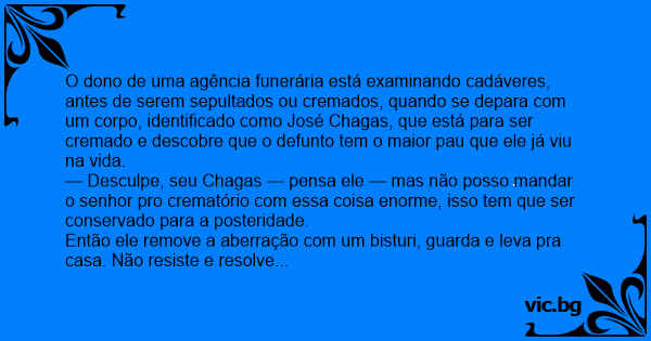 O dono de uma agência funerária está examinando cadáveres, antes de serem sepultados ou cremados, quando se depara com um corpo, identificado como José Chagas, que está para ser cremado e descobre que o defunto tem o maior раu que ele já viu na vida.