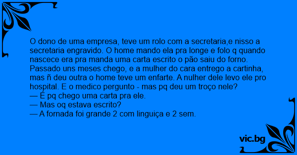 Passado uns meses chego, e a mulher do cara entrego a cartinha, mas ñ deu outra o home teve um enfarte. A nulher dele levo ele pro hospital. E o medico pergunto - mas pq deu um troço nele?