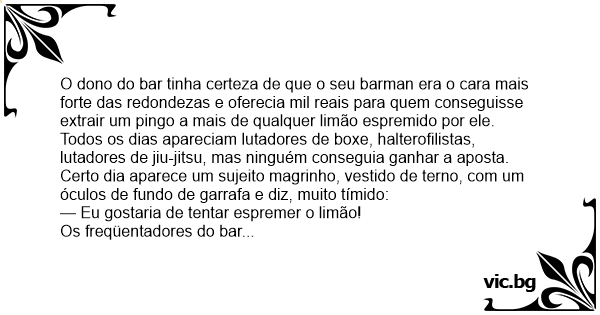 O dono do bar tinha certeza de que o seu barman era o cara mais forte das redondezas e oferecia mil reais para quem conseguisse extrair um pingo a mais de qualquer limão espremido por ele. Todos os dias apareciam lutadores de boxe, halterofilistas, lutadores de jiu-jitsu, mas ninguém conseguia ganhar a aposta.