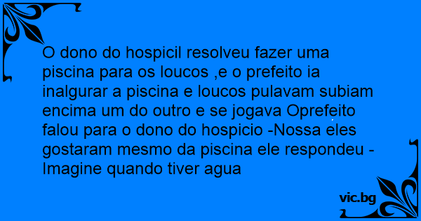 O dono do hospicil resolveu fazer uma piscina para os loucos ,e o prefeito ia inalgurar a piscina e loucos pulavam subiam encima um do outro e se jogava Oprefeito falou para o dono do hospicio -Nossa eles gostaram mesmo da piscina ele respondeu -Imagine quando tiver agua
