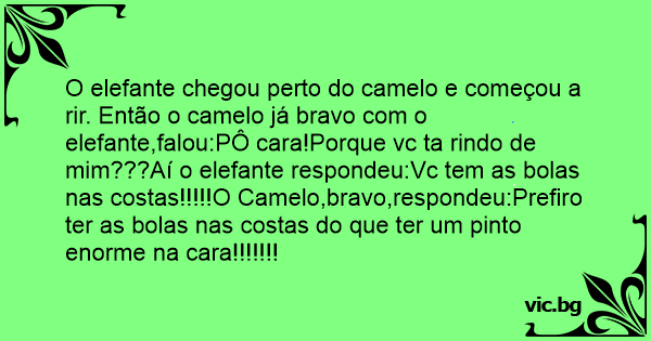 O elefante chegou perto do camelo e começou a rir. Então o camelo já bravo com o elefante,falou:PÔ cara!Porque vc ta rindo de mim???Aí o elefante respondeu:Vc tem as bolas nas costas!!!!!O Camelo,bravo,respondeu:Prefiro ter as bolas nas costas do que ter um pinto enorme na cara!!!!!!!