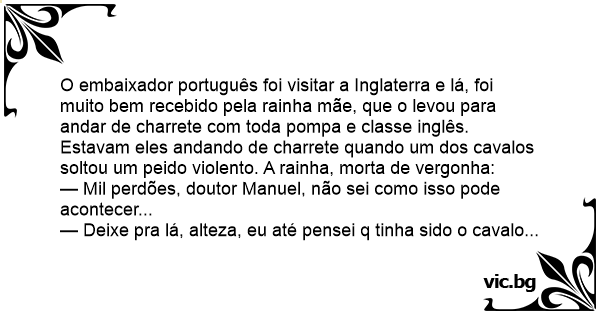 O embaixador português foi visitar a Inglaterra e lá, foi muito bem recebido pela rainha mãe, que o levou para andar de charrete com toda ромра e classe inglês.