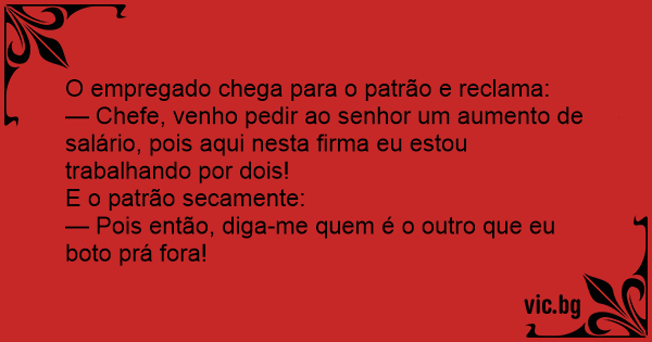 — Chefe, venho pedir ao senhor um aumento de salário, pois aqui nesta firma eu estou trabalhando por dois!