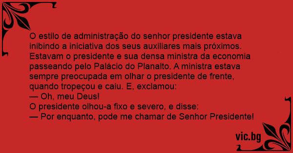 Estavam o presidente e sua densa ministra da economia passeando pelo Palácio do Planalto. A ministra estava sempre preocupada em olhar o presidente de frente, quando tropeçou e caiu. E, exclamou:
