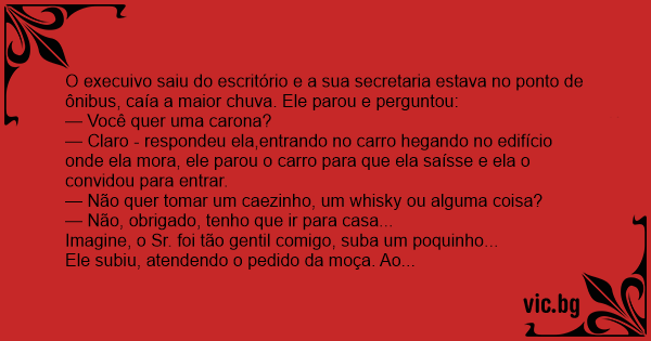 O execuivo saiu do escritório e a sua secretaria estava no ponto de ônibus, caía a maior chuva. Ele parou e perguntou: