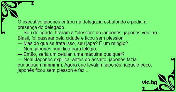 — Seu delegado, tiraram a "plesson" do janponês; japonês veio ao Blasil, foi passear pela cidade e ficou sem plession.