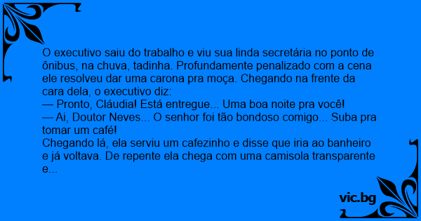 Chegando lá, ela serviu um cafezinho e disse que iria ao banheiro e já voltava. De repente ela chega com uma camisola transparente e agarra o chefe. Logo eles estão na cama, fazendo hоrа extra.