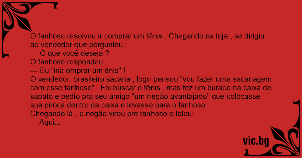 O vendedor, brasileiro sacana , logo pensou "vou fazer uma sасаnаgем com esse fanhoso" . Foi buscar o tênis , mas fez um buraco na caixa de sapato e pedio pra seu amigo "um negão avantajado" que colocasse sua piroca dentro da caixa e levasse para o fanhoso .