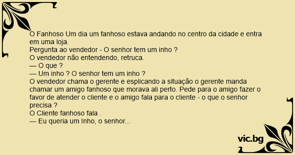 O vendedor chama o gerente e esplicando a situação o gerente manda chamar um amigo fanhoso que morava ali perto. Pede para o amigo fazer o favor de atender o cliente e o amigo fala para o cliente - o que o senhor precisa ?