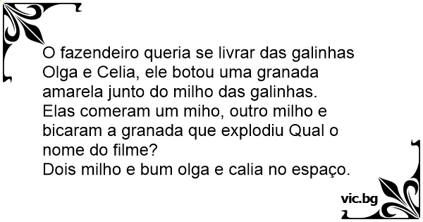 O fazendeiro queria se livrar das galinhas Olga e Celia, ele botou uma granada amarela junto do milho das galinhas.
