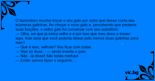 Um fazendeiro compra um galo novo e solta ele no terreiro. Rapidamente o galo novo rouba todas as galinhas do galo velho. Então o galo velho propos um acordo. Galo velho: MEU JOVEM VAMOS...