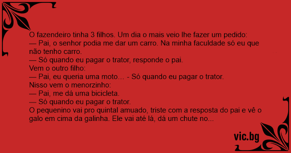 O fazendeiro tinha 3 filhos. Um dia o mais veio lhe fazer um pedido: