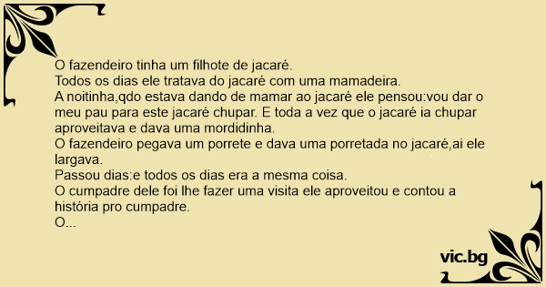 A noitinha,qdo estava dando de mamar ao jacaré ele pensou:vou dar o meu раu para este jacaré сhuраr. E toda a vez que o jacaré ia сhuраr aproveitava e dava uma mordidinha.