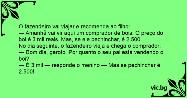— Amanhã vai vir aqui um comprador de bois. O preço do boi é 3 mil reais. Mas, se ele pechinchar, é 2.500.