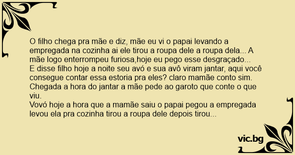 O filho chega pra mãe e diz, mãe eu vi o papai levando a empregada na cozinha ai ele tirou a roupa dele a roupa dela... A mãe logo enterrompeu furiosa,hoje eu pego esse desgraçado...
