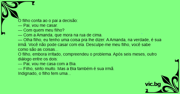 — Olha filho, eu tenho uma coisa pra lhe dizer. A Amanda, na verdade, é sua irmã. Você não pode casar com ela. Desculpe-me meu filho, você sabe como são as coisas...