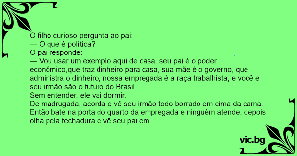 O filho fala para o pai: — Pai, eu preciso fazer um trabalho para a escola, posso te fazer uma pergunta? — Claro meu filho. Qual é a pergunta? — O que é Política, pai? — Bem, vou usar a nossa casa...