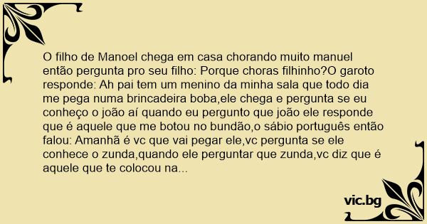 O filho de Manoel chega em casa chorando muito manuel então pergunta pro seu filho: Porque choras filhinho?O garoto responde: Ah pai tem um menino da minha sala que todo dia me pega numa brincadeira boba,ele chega e pergunta se eu conheço o joão aí quando eu pergunto que joão ele responde que é aquele que me botou no bundão,o sábio português então falou: Amanhã é vc que vai pegar ele,vc pergunta se ele conhece o zunda,quando ele perguntar que zunda,vc diz que é aquele que te colocou na bunda,o menino todo sorridente diz: Boa pai amanhã eu pego ele,no dia seguinte o filho do Manoel pertunta o tal muleque: Ei vc conhece o zunda,o muleque responde : Conheço é o irmão do joão,o portuguezinho pergunta que joão?