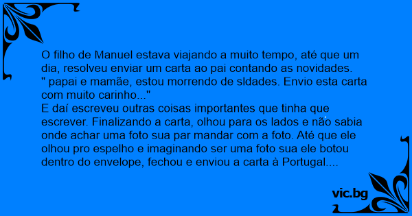 Chegando lá após ler a darta,manuel pegou o espelho, olho para seu reflexo e, pensando ser a foto de seu filho, chamou Maria, sua mulher, e comentou: