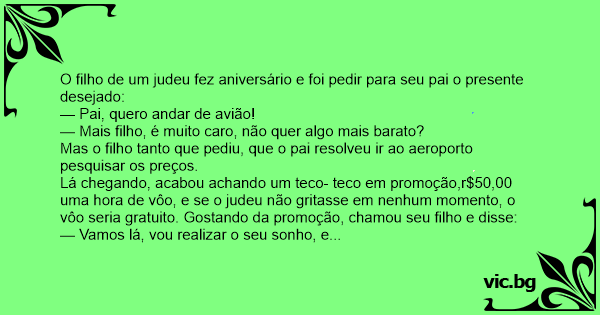 Lá chegando, acabou achando um teco- teco em promoção,r$50,00 uma hоrа de vôo, e se o judeu não gritasse em nenhum momento, o vôo seria gratuito. Gostando da promoção, chamou seu filho e disse: