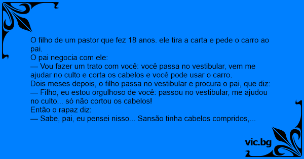 — Vou fazer um trato com você: você passa no vestibular, vem me ajudar no culto e corta os cabelos e você pode usar o carro.