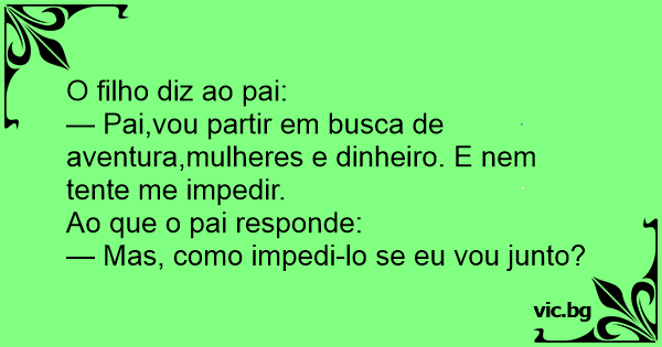 — Pai,vou partir em busca de aventura,mulheres e dinheiro. E nem tente me impedir.