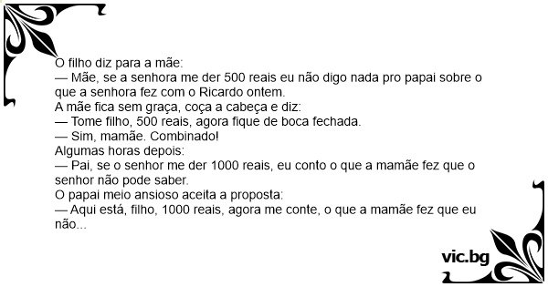 — Mãe, se a senhora me der 500 reais eu não digo nada pro papai sobre o que a senhora fez com o Ricardo ontem.