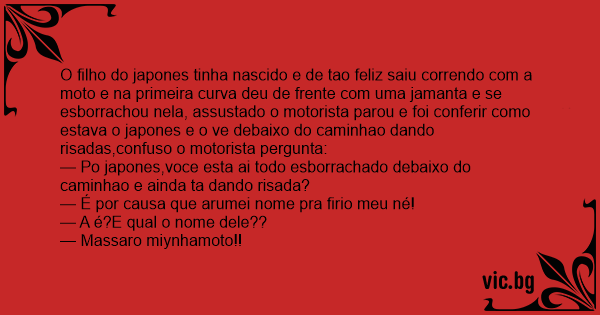 O filho do japones tinha nascido e de tao feliz saiu correndo com a moto e na primeira curva deu de frente com uma jamanta e se esborrachou nela, assustado o motorista parou e foi conferir como estava o japones e o ve debaixo do caminhao dando risadas,confuso o motorista pergunta: