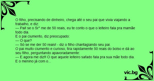 — Pai! se o Sr° me de 50 reais, eu te conto o que o leiteiro fala pra mamãe todo dia.