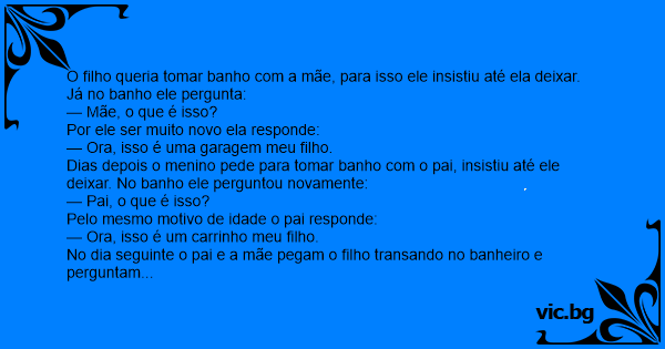 Dias depois o menino pede para tomar banho com o pai, insistiu até ele deixar. No banho ele perguntou novamente: