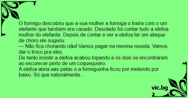 O formigo descobriu que a sua mulher a formiga o traíra com o um elefante que também era casado. Desolado foi contar tudo a elefoa mulher do elefante. Depois de contar e ver a elefoa ter um ataque de choro ele sugeriu: