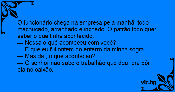 O funcionário chega na empresa pela manhã, todo machucado, arranhado e inchado. O patrão logo quer saber o que tinha acontecido: