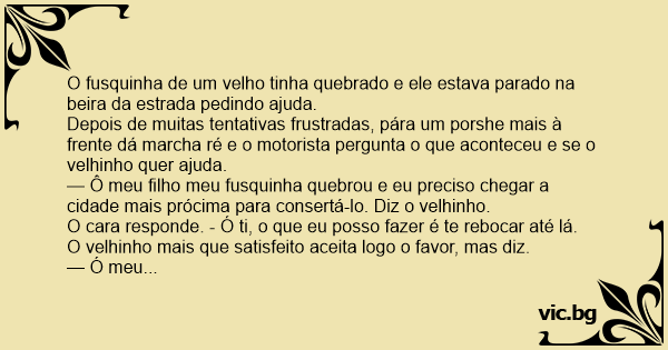 — Ô meu filho meu fusquinha quebrou e eu preciso chegar a cidade mais prócima para consertá-lo. Diz o velhinho.