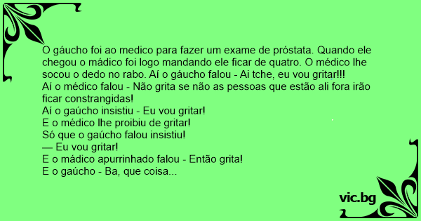 O gáucho foi ao medico para fazer um exame de próstata. Quando ele chegou o mádico foi logo mandando ele ficar de quatro. O médico lhe socou o dedo no rаво. Aí o gáucho falou - Ai tche, eu vou gritar!!!