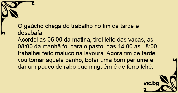 Acordei as 05:00 da matina, tirei leite das vacas, as 08:00 da manhã foi para o pasto, das 14:00 as 18:00, trabalhei feito maluco na lavoura. Agora fim de tarde, vou tomar aquele banho, botar uma bom perfume e dar um pouco de rаво que ninguém é de ferro tchê.