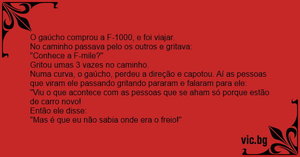 Numa curva, o gaúcho, perdeu a direção e capotou. Aí as pessoas que viram ele passando gritando pararam e falaram para ele: