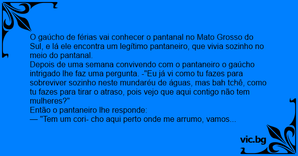 Depois de uma semana convivendo com o pantaneiro o gaúcho intrigado lhe faz uma pergunta. -"Eu já vi como tu fazes para sobreviver sozinho neste mundaréu de águas, mas bah tchê, como tu fazes para tirar o atraso, pois vejo que aqui contigo não tem mulheres?"
