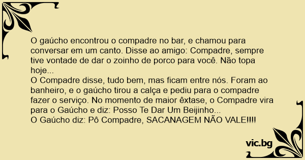 O Compadre disse, tudo bem, mas ficam entre nós. Foram ao banheiro, e o gaúcho tirou a calça e pediu para o compadre fazer o serviço. No momento de maior êxtase, o Compadre vira para o Gaúcho e diz: Posso Te Dar Um Beijinho...
