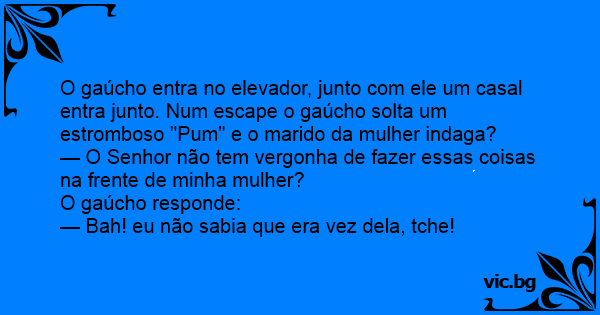 O gaúcho entra no elevador, junto com ele um casal entra junto. Num escape o gaúcho solta um estromboso "Pum" e o marido da mulher indaga?