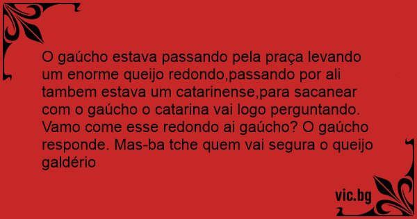 O gaúcho estava passando pela praça levando um enorme queijo redondo,passando por ali tambem estava um catarinense,para sacanear com o gaúcho o catarina vai logo perguntando. Vamo come esse redondo ai gaúcho? O gaúcho responde. Mas-ba tche quem vai segura o queijo galdério