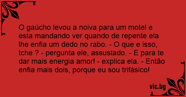 O gaúcho levou a noiva para um motel e esta mandando ver quando de repente ela lhe enfia um dedo no rаво. - O que e isso, tche ? - pergunta ele, assustado. - E para te dar mais energia amor! - explica ela. - Então enfia mais dois, porque eu sou trifásico!