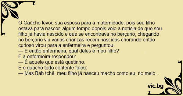 — Mas Bah tchê, meu filho já nasceu macho como eu, no meio dessa choradeira toda meu filho é o único que não está chorando.