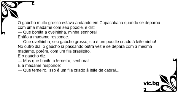 O gaúcho muito grosso estava andando em Copacabana quando se deparou com uma madame com seu poodle, e diz: