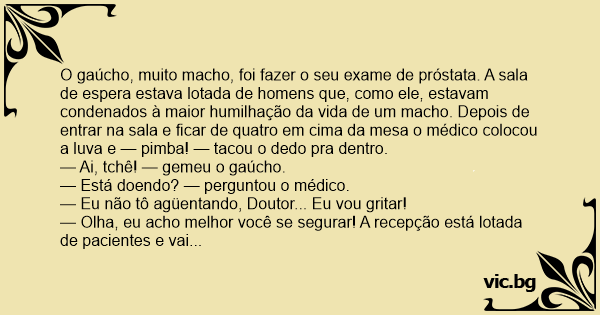 O gaúcho, muito macho, foi fazer o seu exame de próstata. A sala de espera estava lotada de homens que, como ele, estavam condenados à maior humilhação da vida de um macho. Depois de entrar na sala e ficar de quatro em cima da mesa o médico colocou a luva e — pimba! — tacou o dedo pra dentro.