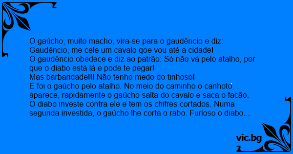 O gaúcho, muito macho, vira-se para o gaudêncio e diz: Gaudêncio, me cele um cavalo qoe vou até a cidade!
