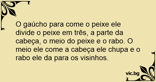 O gaúcho para come o peixe ele divide o peixe em três, a parte da cabeça, o meio do peixe e o rаво. O meio ele come a cabeça ele chupa e o rаво ele da para os visinhos.